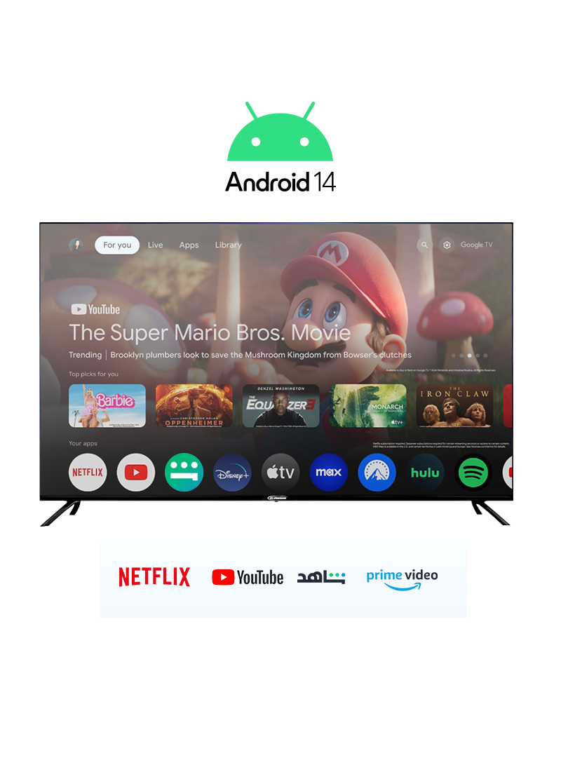 - نظام أندرويد 14 سمارت: نظام تشغيل قوي ومريح يوفر لك إمكانية الوصول إلى تطبيقات وخدمات متعددة مثل نتفليكس، يوتيوب، شاهد، و برايم فيديو.